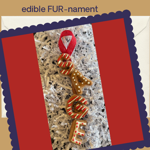 Each FUR-nament is handmade, customizable with up to 6 letters, and baked fresh for the holidays. (please include your pet's name when placing your order.)